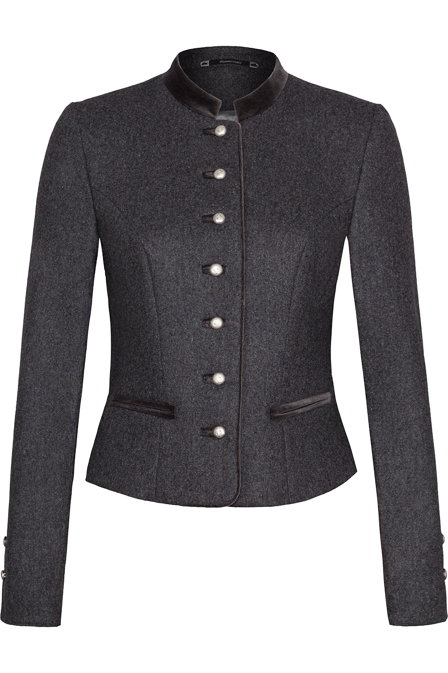 • Stehkragen, Knopfleiste und Ärmelsaum schwarz eingefasst