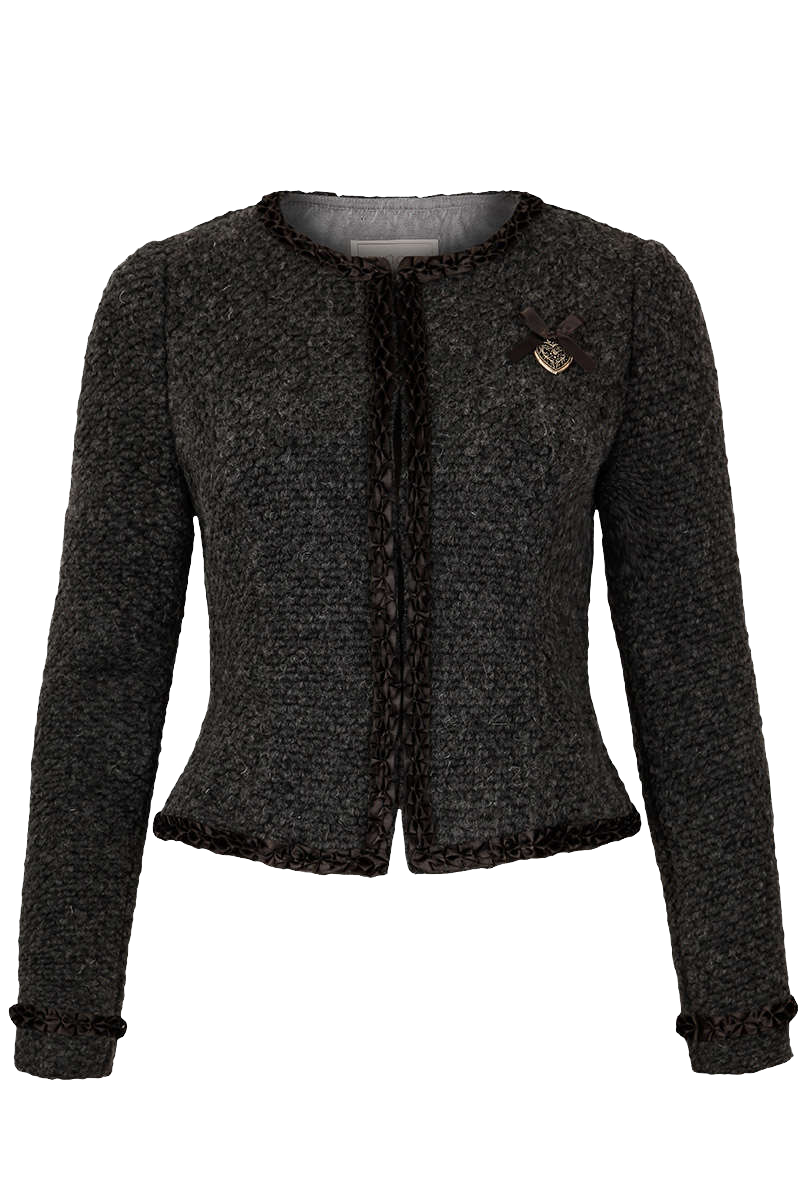 • Schicke hellgrau Dirndl-Jacke mit seidener Ton in Ton Froschmaul-Bordüre