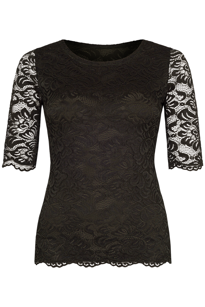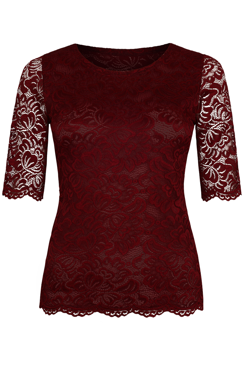 - Doppellagig gefertigt: Die Bluse besteht aus einer Lage transparenter Spitze mit einem gleichfarbigen, blickdichten Tüllstoff darunter, während die Ärmel durchsichtig bleiben.