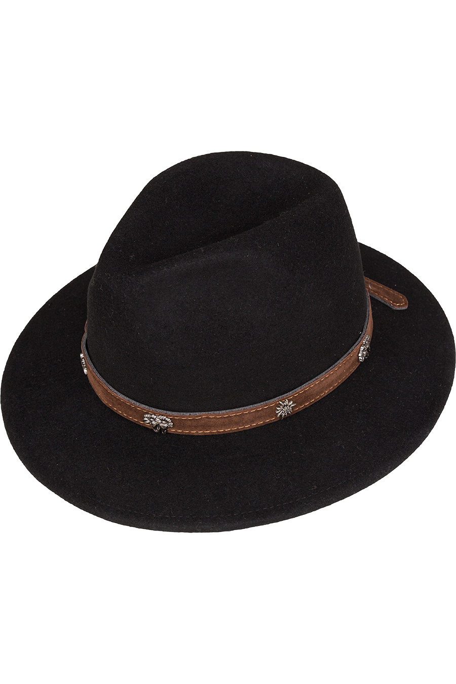 - Mit Hutgarnitur aus Kunstlederband, verziert mit silberfarbenen Alpenblumen.