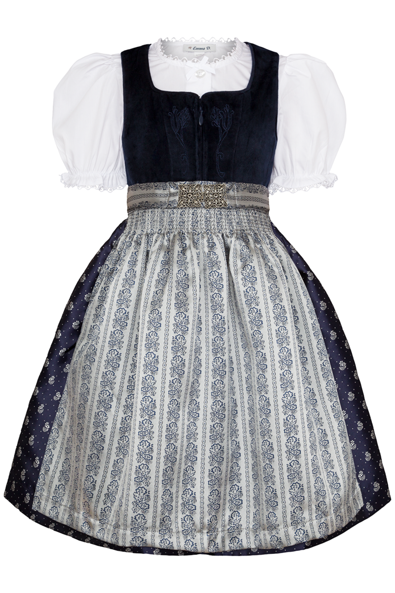 • Edles Design: Kinderdirndl in tiefdunklem Blau mit schimmernder silberner Schürze für festliche Anlässe.
