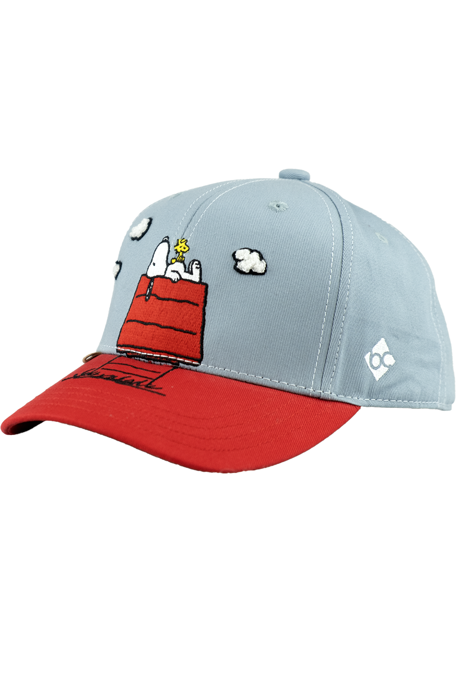 • Kinder Cap 'Snoopy schläft' von Bavarian Caps mit liebevollem Design — Snoopy & Woodstock schlafend auf der Hundehütte als feine Stickerei.