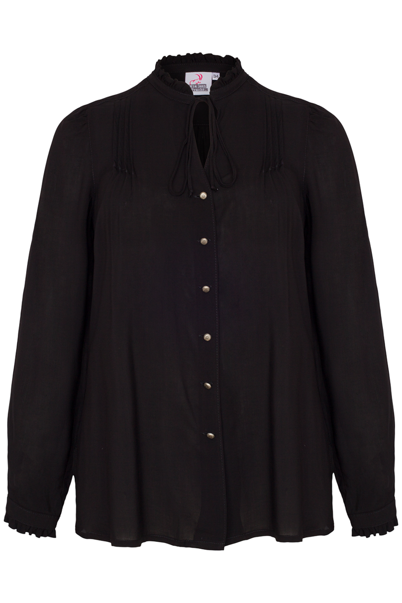 • Mit Biesenverarabeitung im Vorderteil und Rüschen am Stehkragen, der mit Bändchen geschlossen werden kann