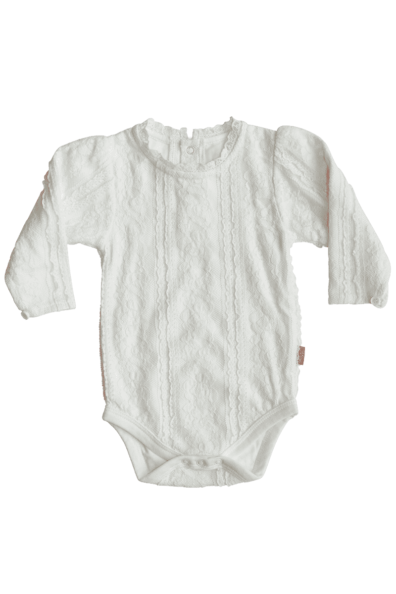 • Entzückender langarm Baby-Body der Marke Mogo in der Farbe offwhite mit zarter Spitze im Blumendesign