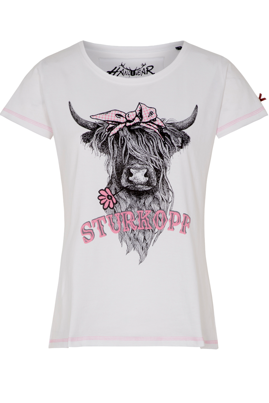 • Damen T-Shirt QUENTAYA von hangOwear mit frechem Frontprint mit Hochlandrind, Schleife und „Sturkopf“-Aufdruck.