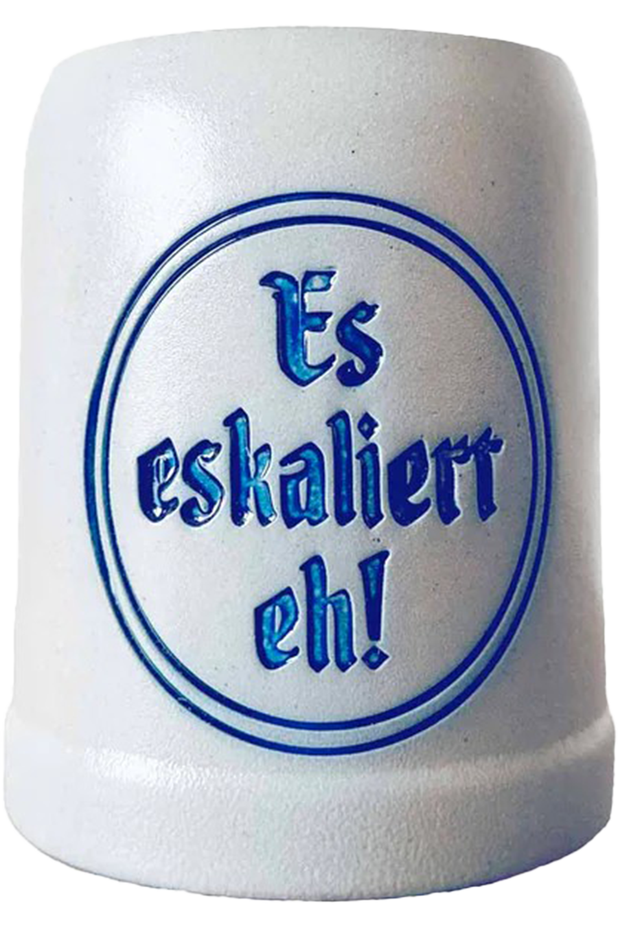 • Bierkrug 'Es eskaliert eh!' von Gaudiknopf – salzglasiertes Steinzeug mit humorvollem Schriftzug in Frakturschrift.