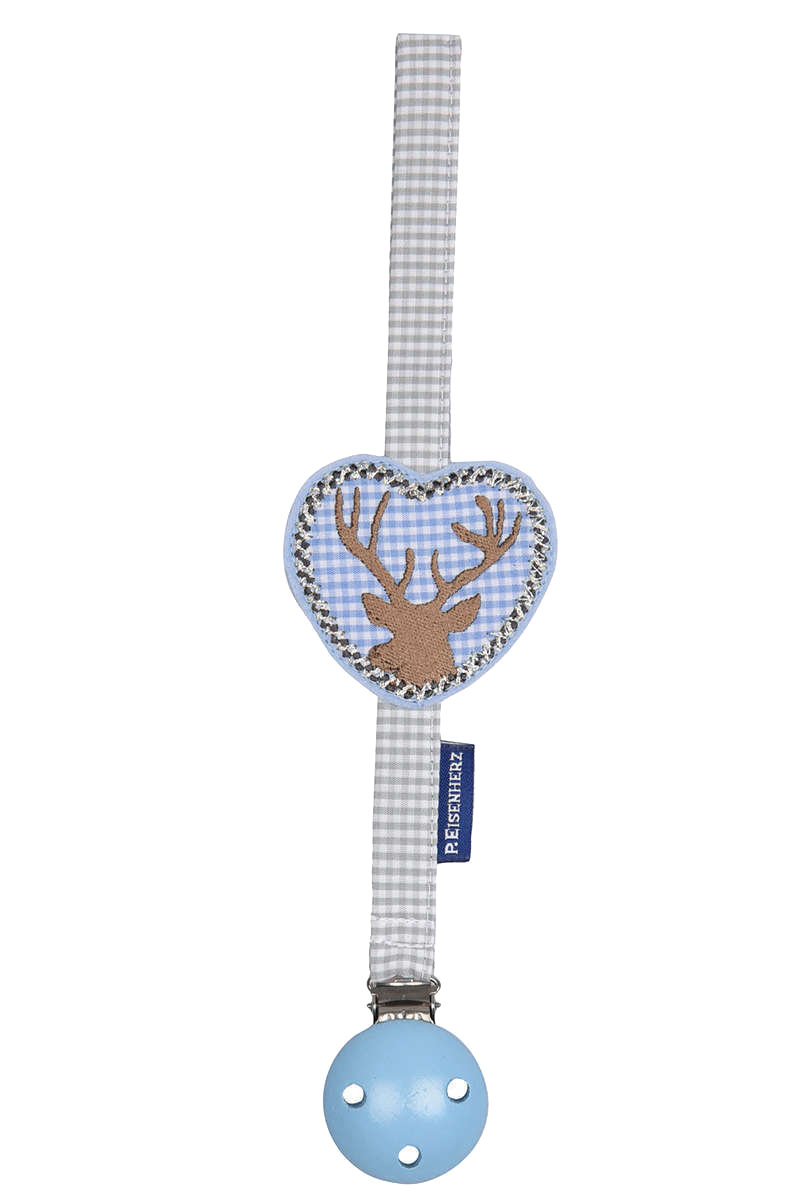• Hellblauer Holzklipp mit grauem Vichy-Karo-Band und Filz-Herz mit gesticktem Hirsch