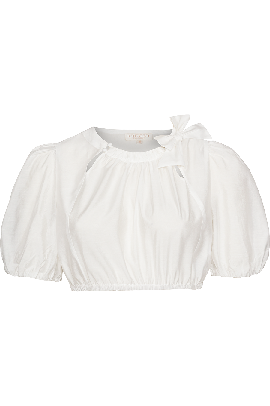 • Die hochwertige Dirndlbluse von Krüger besticht durch ihr hochgeschlossenes Design mit seitlicher Schleife am Kragen und feinen Knopfdetails.