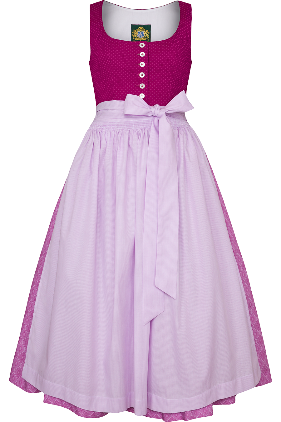• Stilvoller Mustermix: Mieder mit feinem Punktemuster, Rock mit zartem Wabenmuster und gestreifter Baumwollschürze.