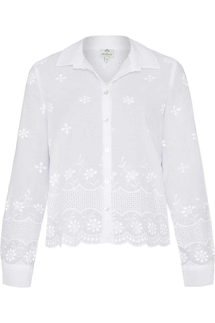 • Trachtenbluse für Damen von Berwin mit zarter floraler Lochstickerei für einen romantisch-verspielten Trachtenlook.