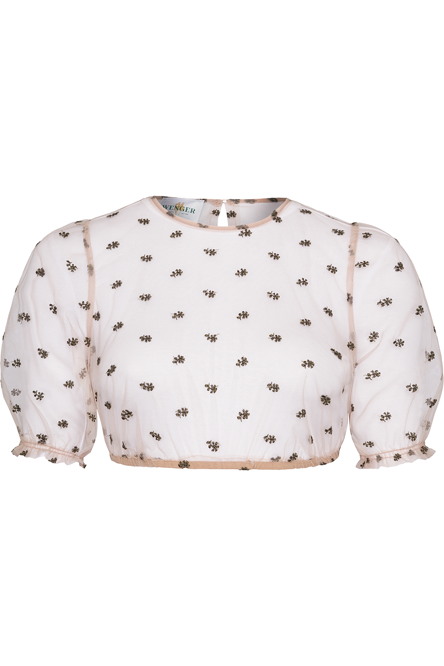 • Die Dirndlbluse COLIN von Wenger Austria besticht durch feinen, transparenten Tüll mit aufwendiger floraler Stickerei in Kontrastfarbe.