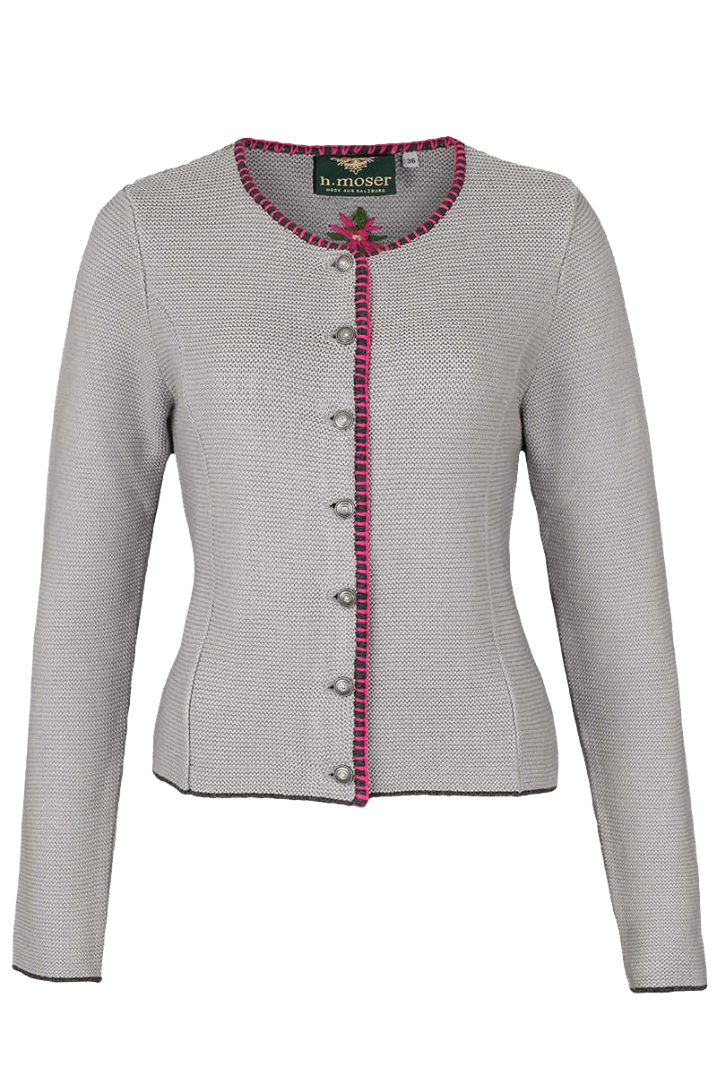 • Pinke Ziernaht am Ausschnitt und an der Knopfleiste