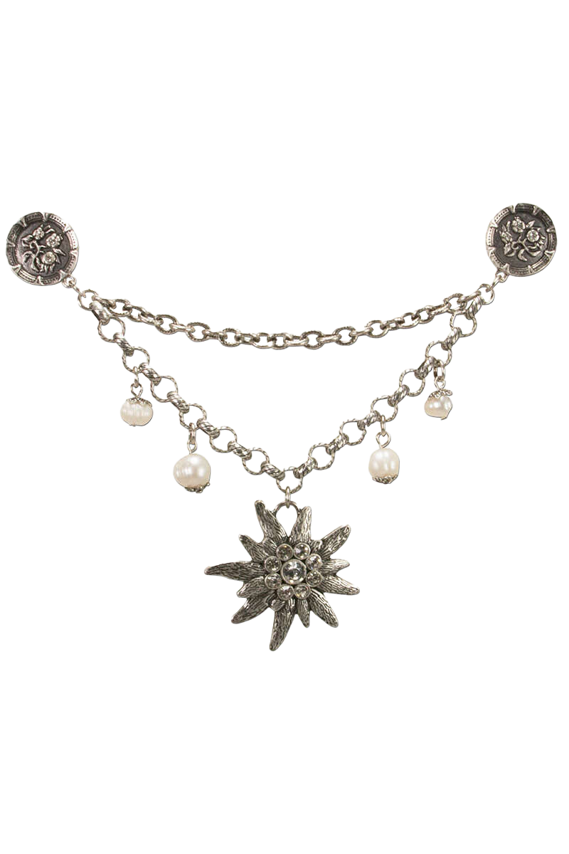 • 16 cm lange Metallkette, zwei Pins zum Befestigen am Dirndl-Ausschnitt oder an der Schürze