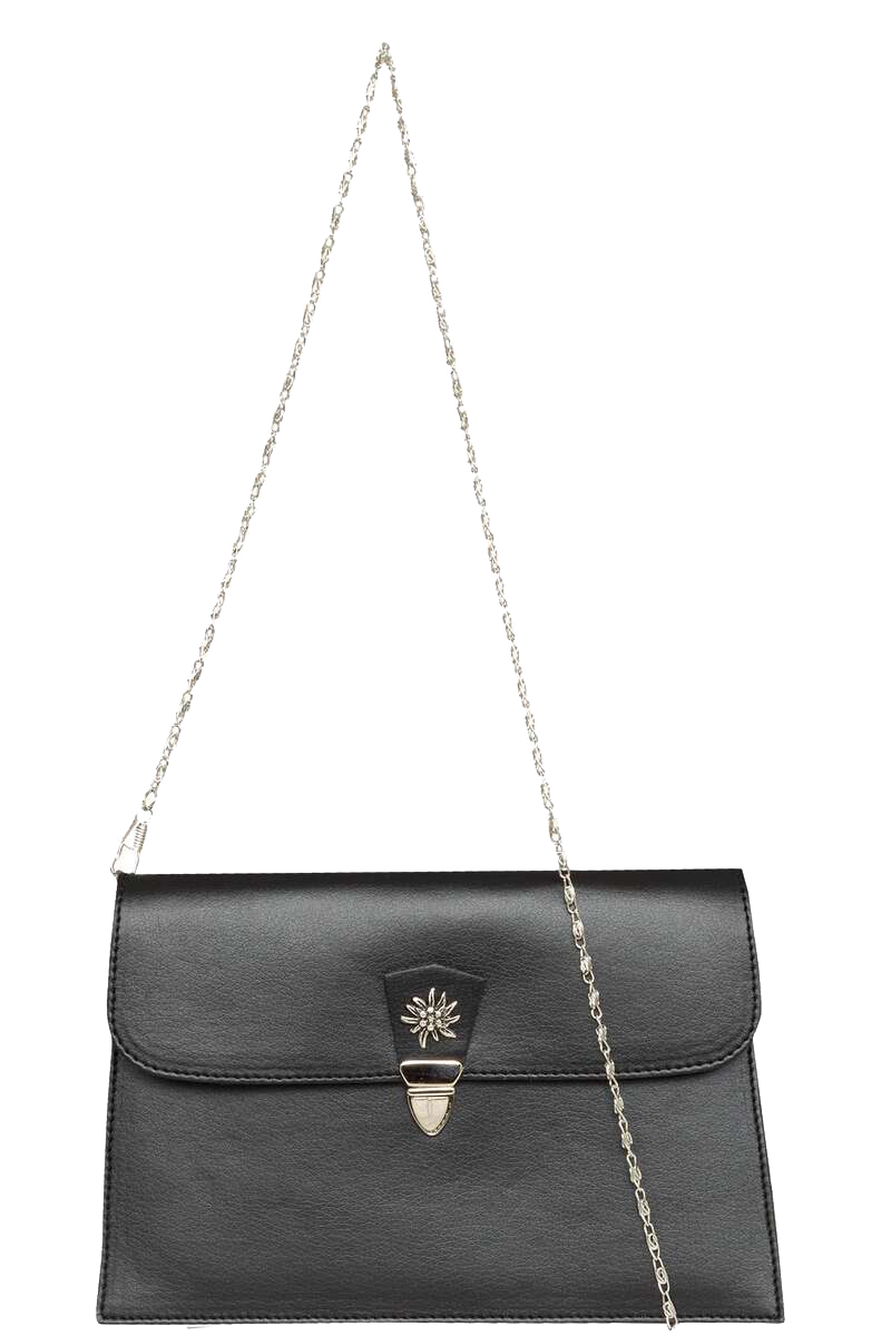 • Geschlossen mit silberner Schnalle und Edelweiß-Schmuckelement auf schwarzem Kunstleder.