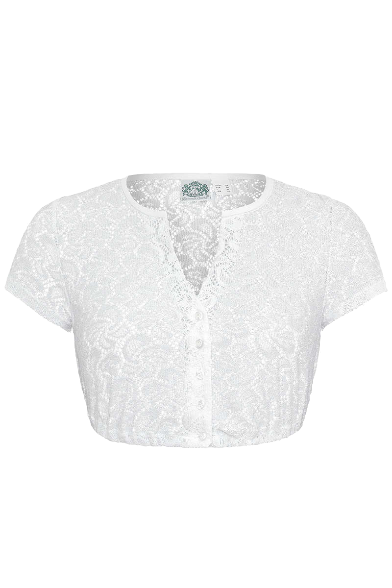 • Die weiße Dirndlbluse Gerlinde ist aus Strickgewebe mit zahlreichen Durchbrüchen gearbeitet.