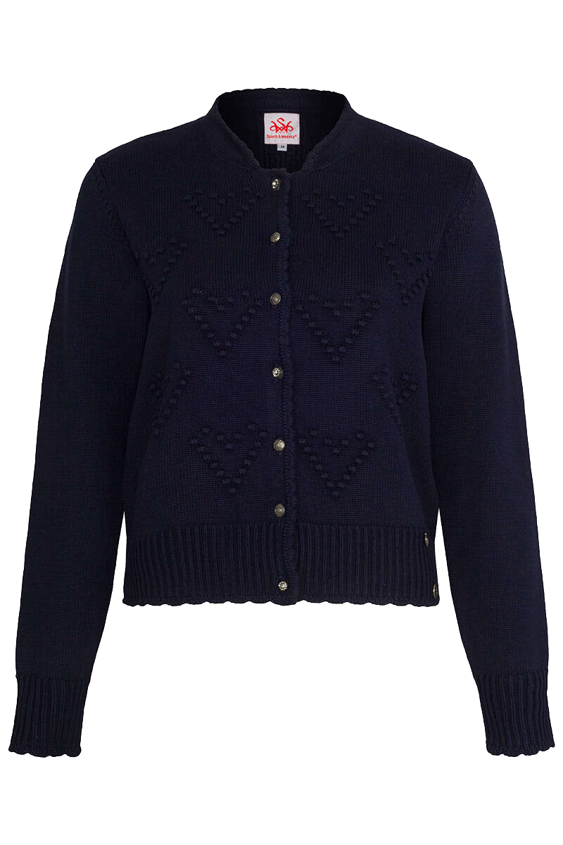 • Design und Charme: Diese dunkelblaue Damen-Strickjacke der Marke Spieth & Wensky beeindruckt mit ihrem feschen Look, der durch eingestrickte kugelförmige Erhebungen ein Herzchen-Muster ergibt.