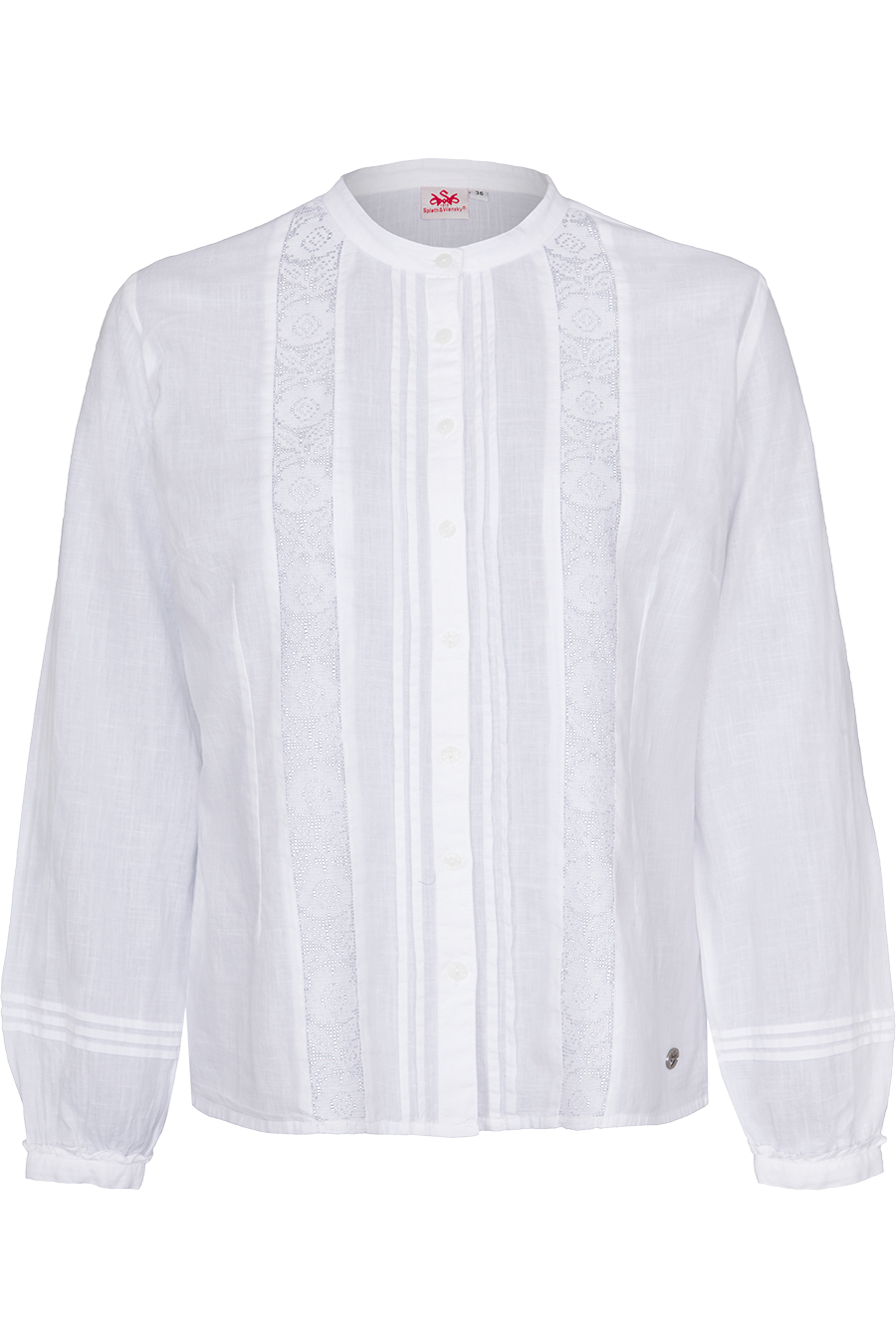 • Feine Biesen & florale, leicht durchscheinendeSpitzeneinsätze neben der Knopfleiste