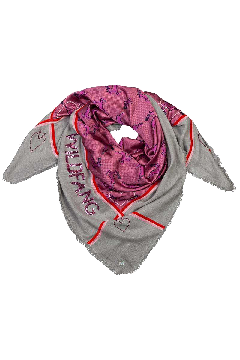 • Schriftzug "WILDFANG" zweifach in leuchtenden Pailletten auf den breiten grauen Rändern aufgestickt
