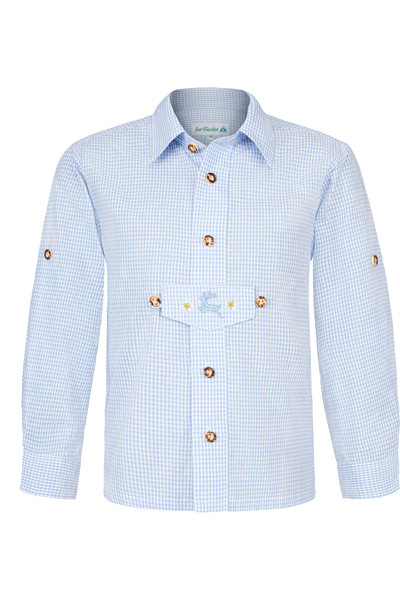 - Ein hellblau-weiß kariertes Kinderhemd mit Umlegekragen für die kleinen Trachtenliebhaber