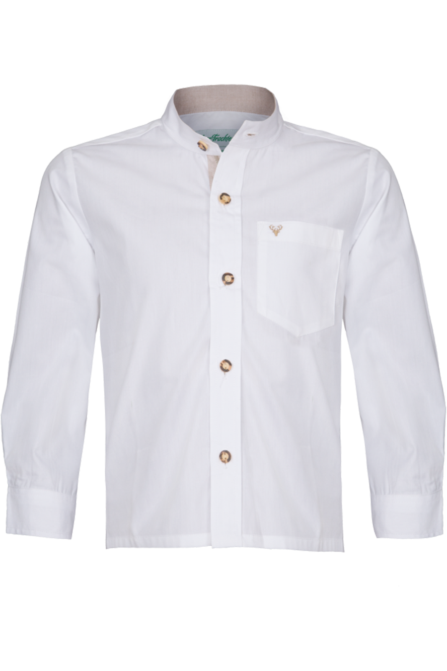 • Trachtenhemd für Kinder von Isar-Trachten: Klassischer Look für kleine Buam – mit kleinem Stehkragen und traditionellen Knöpfen in Hirschhornoptik.