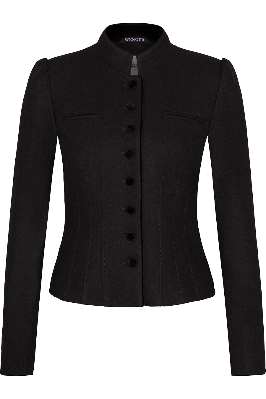 • Samtbesetzter Stehkragen und Knopfleiste mit edlen Samtknöpfen