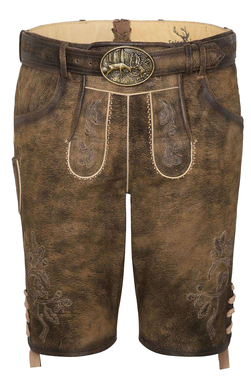 • Eine kernige kurze Lederhose für g´standene Mannsbilder aus braunem Leder in Antik-Optik