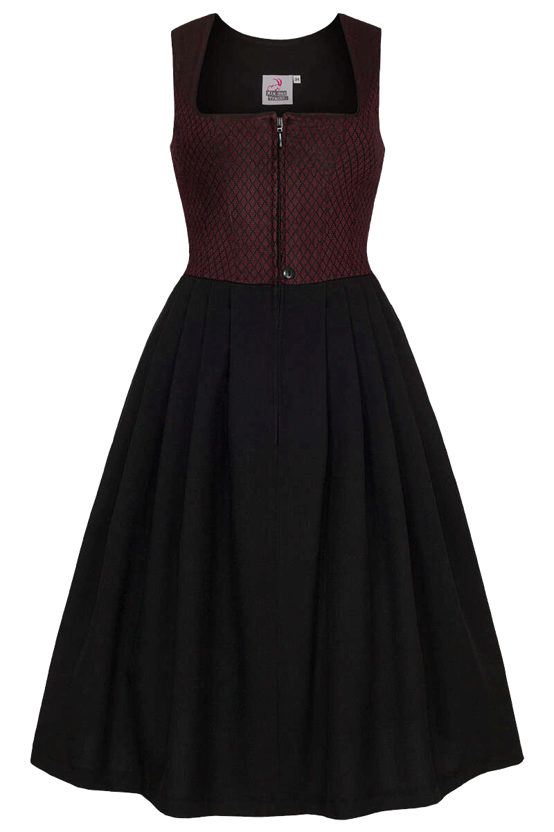 • Gemustertes Mieder: Das Mieder des Dirndls verfügt über einen eckigen Ausschnitt und ist mit attraktiven weinroten Punkten gemustert. Traditionelle Wiener Nähte betonen das Design.