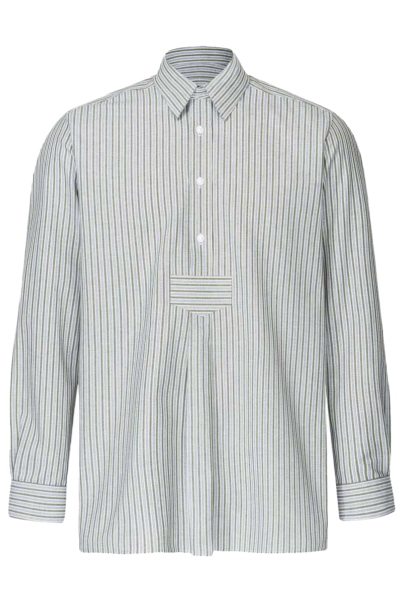 • Detailreiche Gestaltung: Die Knopfleiste mit weißen Waschknöpfen, geführt bis zum Riegel, und die Falten unterhalb des Riegels verleihen dem Hemd raffinierte Details und traditionellen Charme.