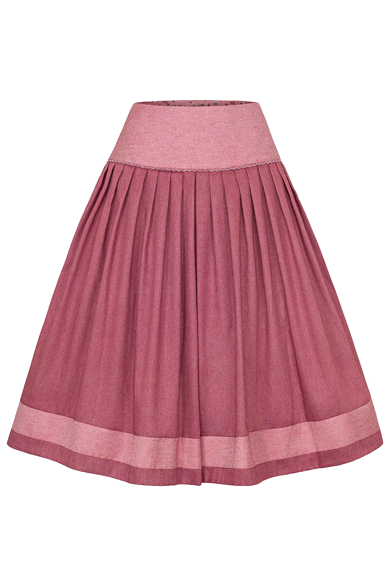 • Das Webmuster des Trachtenrocks hat eine leicht melierte Optik und der 12 cm breite Bund, an dem eine wunderschöne Paspel in Kordeloptik angebracht ist, sowie die Saumblende sind aus einem hochwertigen österreichischen Ton-in-Ton-Jaquardstoff